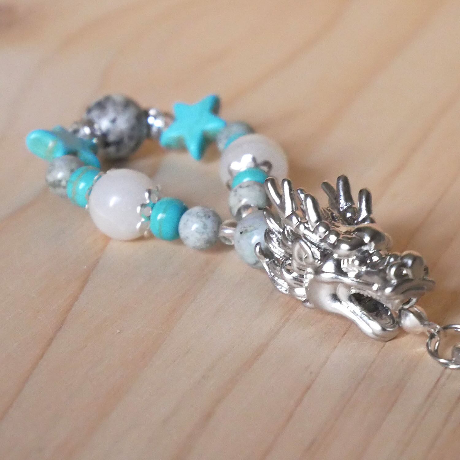 八郷雲龍石:10mm 1個 静岡水晶:10mm 2個 富士さざれ石:8mm 1個・6mm 4個 ターコイズ:6×4mm 4個・11×4mm 2個 水晶:6mm 1個・3mm 8個 ロンデル:5×3mm 2個