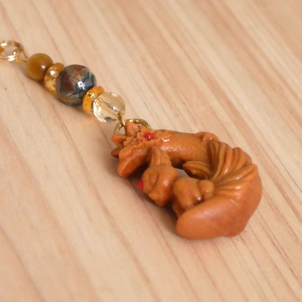 木彫りの三日月に乗った可愛い九尾の狐とタイチンルチル、シトリン、ゴールデンタイガーズアイのストラップです。