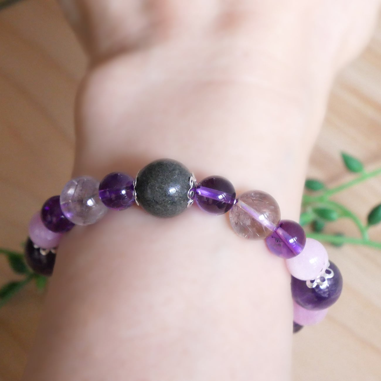 天照石:12mm 2個 シェブロンアメジスト:12mm 2個 スーパーセブン:11mm 4個 クンツァイト:9mm 4個 アメジスト:8mm 8個