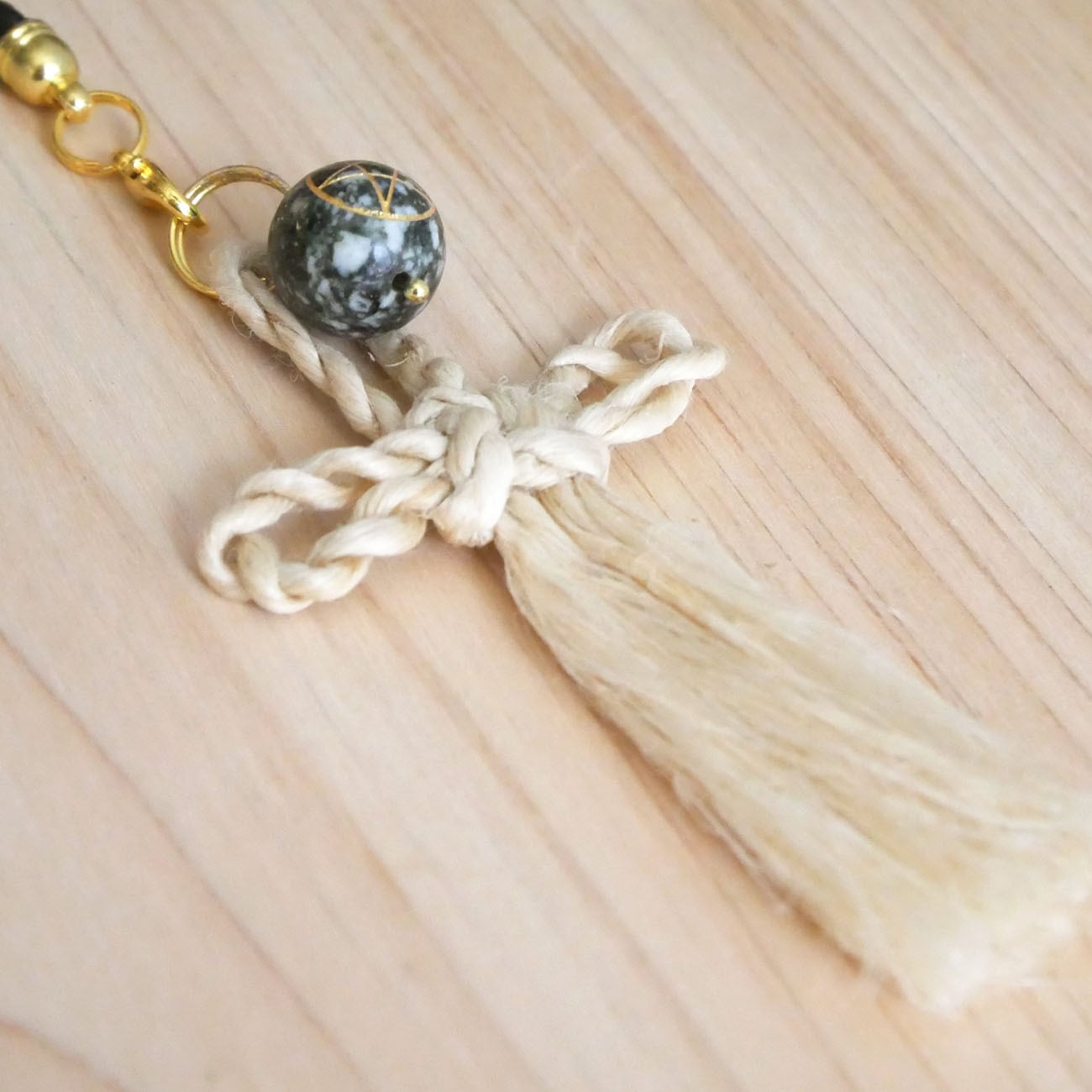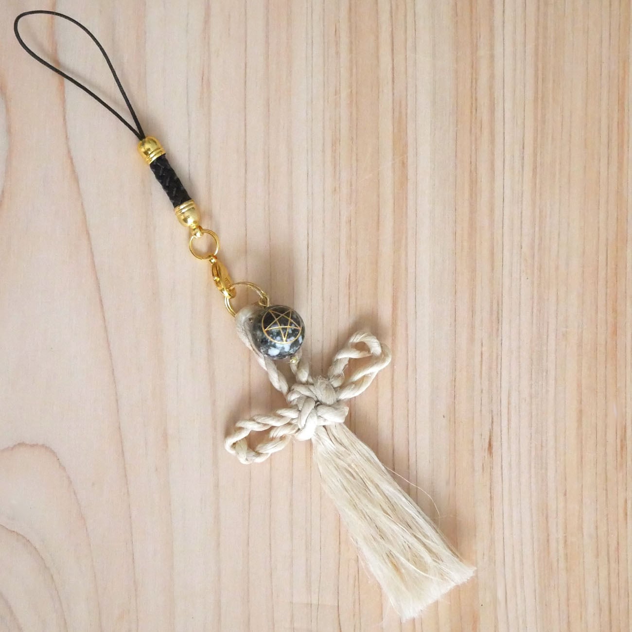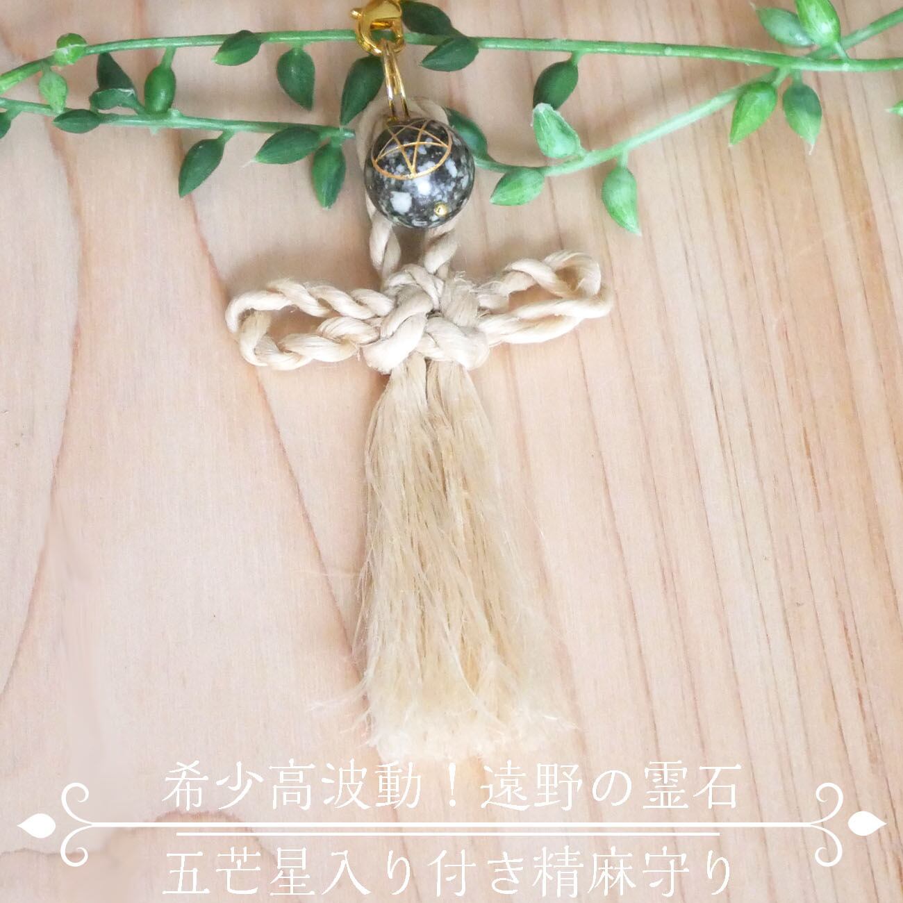 ストラップ付きなのでバッグチャームにして持ち歩いたり、玄関やベッドサイドに飾ったり、精麻の房で身体の穢れを払うこともでき、精麻の房を手で撫でることで浄化されます。