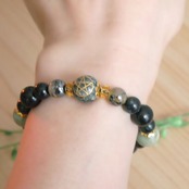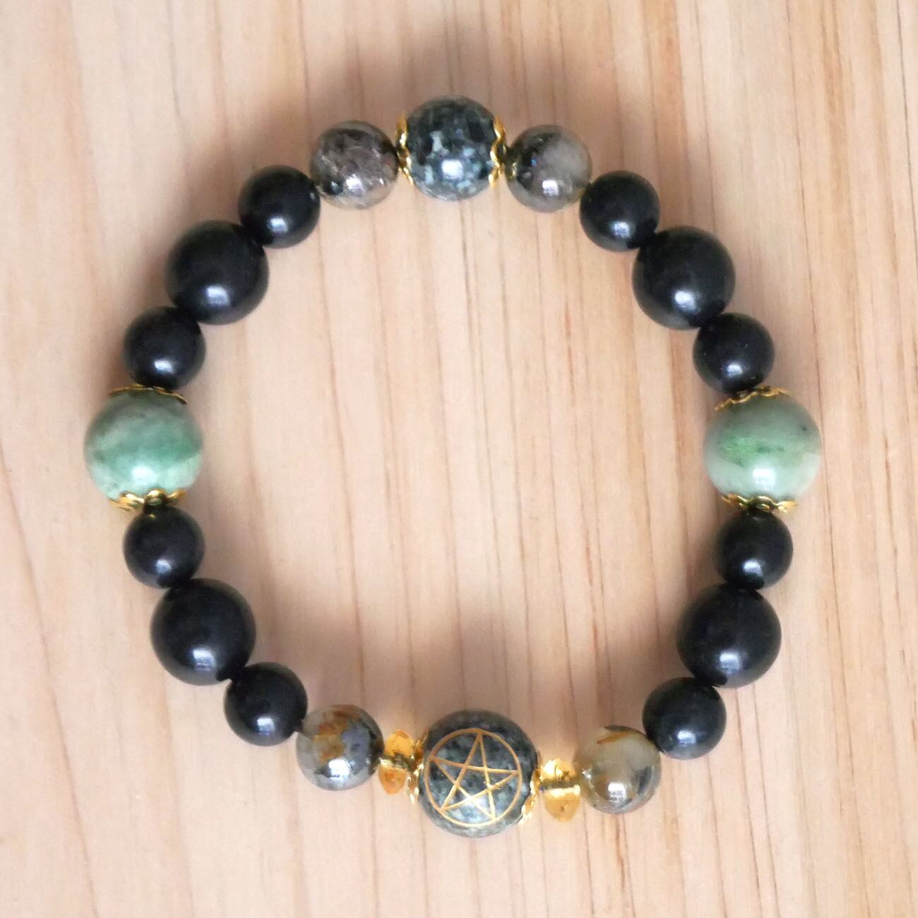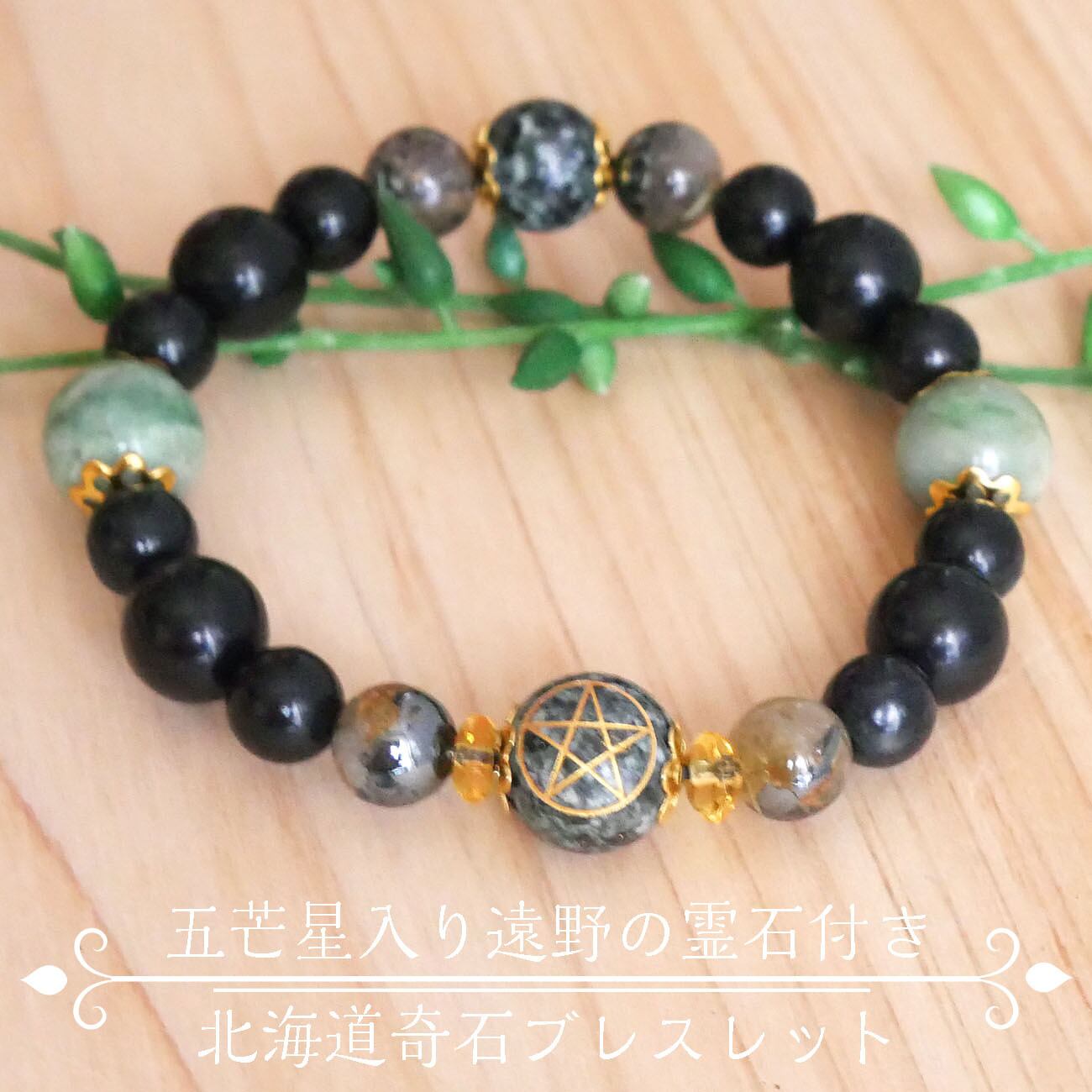 岩手県遠野市内のただ1つの山でしか採取できず希少で高波動!遠野の霊石の五芒星入り、北海道神居古潭峡谷のみで採掘される霊石、神居古潭石、希少な日高ヒスイなどを組み合わせたパワーストーンブレスレットです。