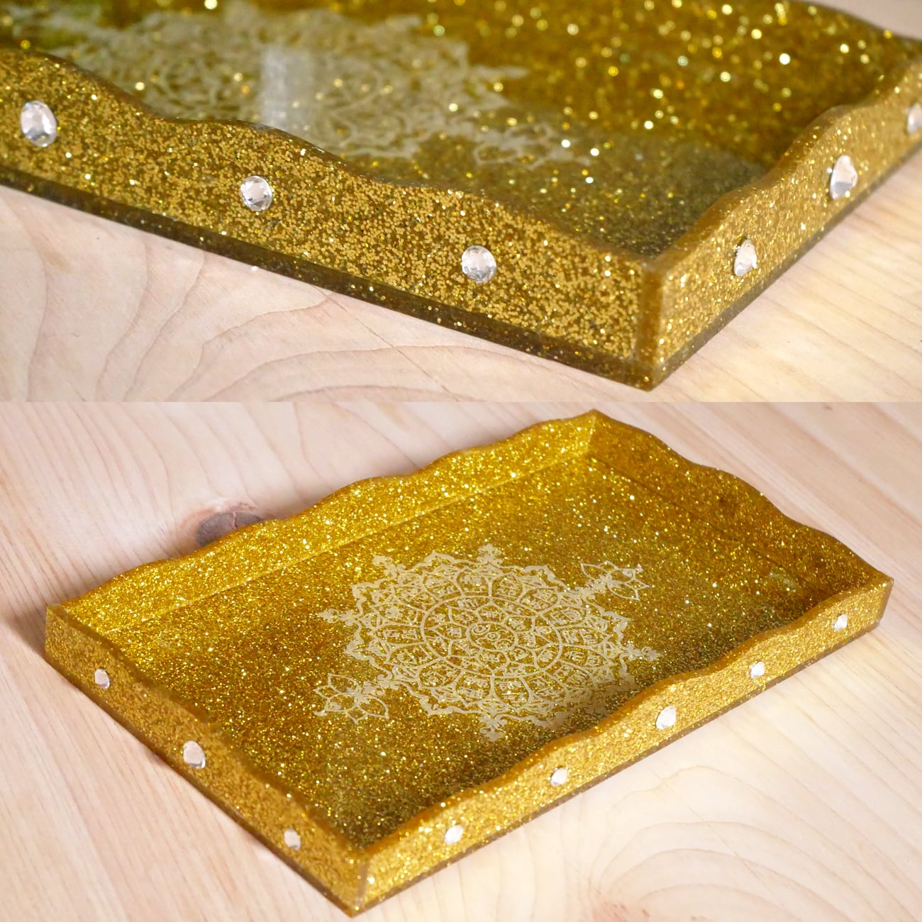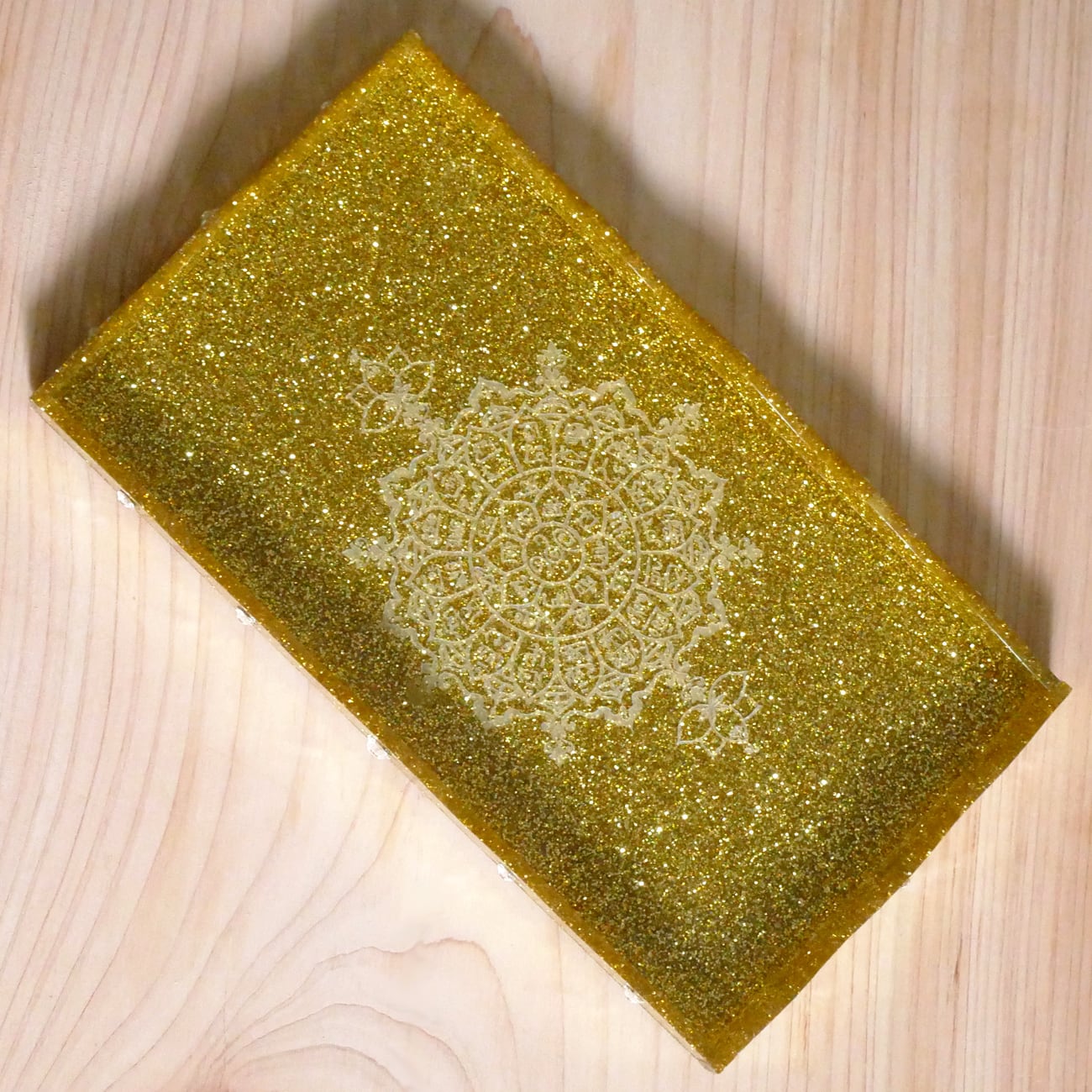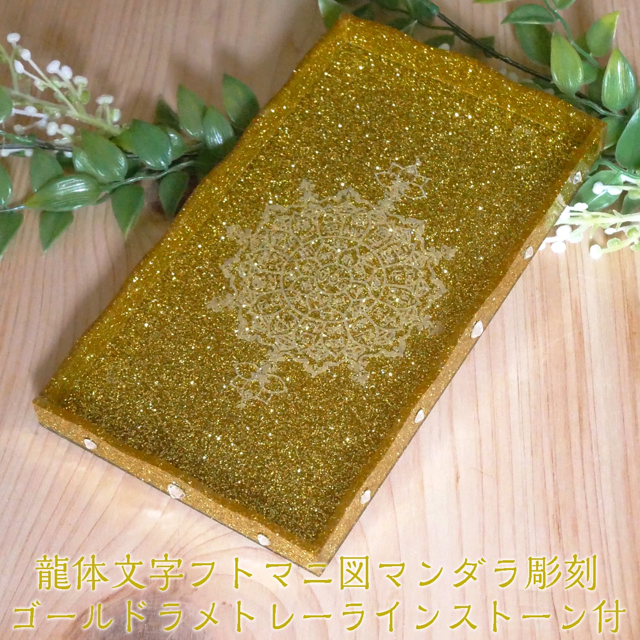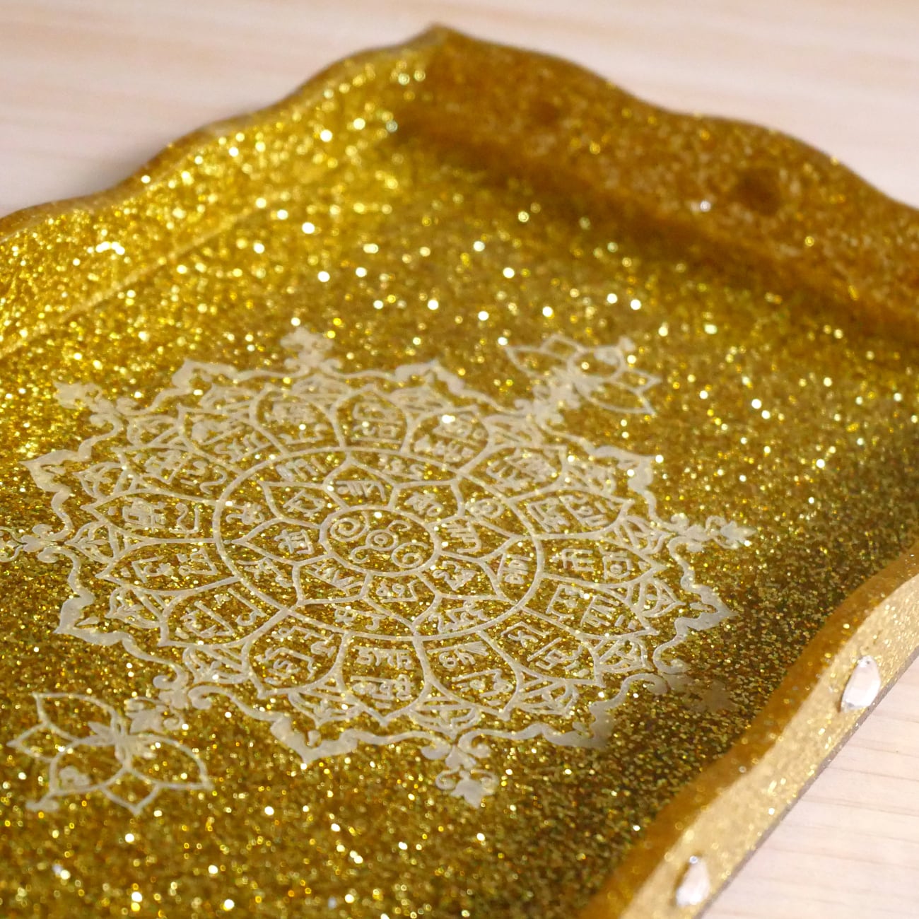 開運・引寄せ効果があるといわれる龍体文字フトマニ図をオリジナルマンダラ柄にして、キラキラのゴールドラメがびっしり詰まったアクリル板にレーザー彫刻をしたトレーです。
