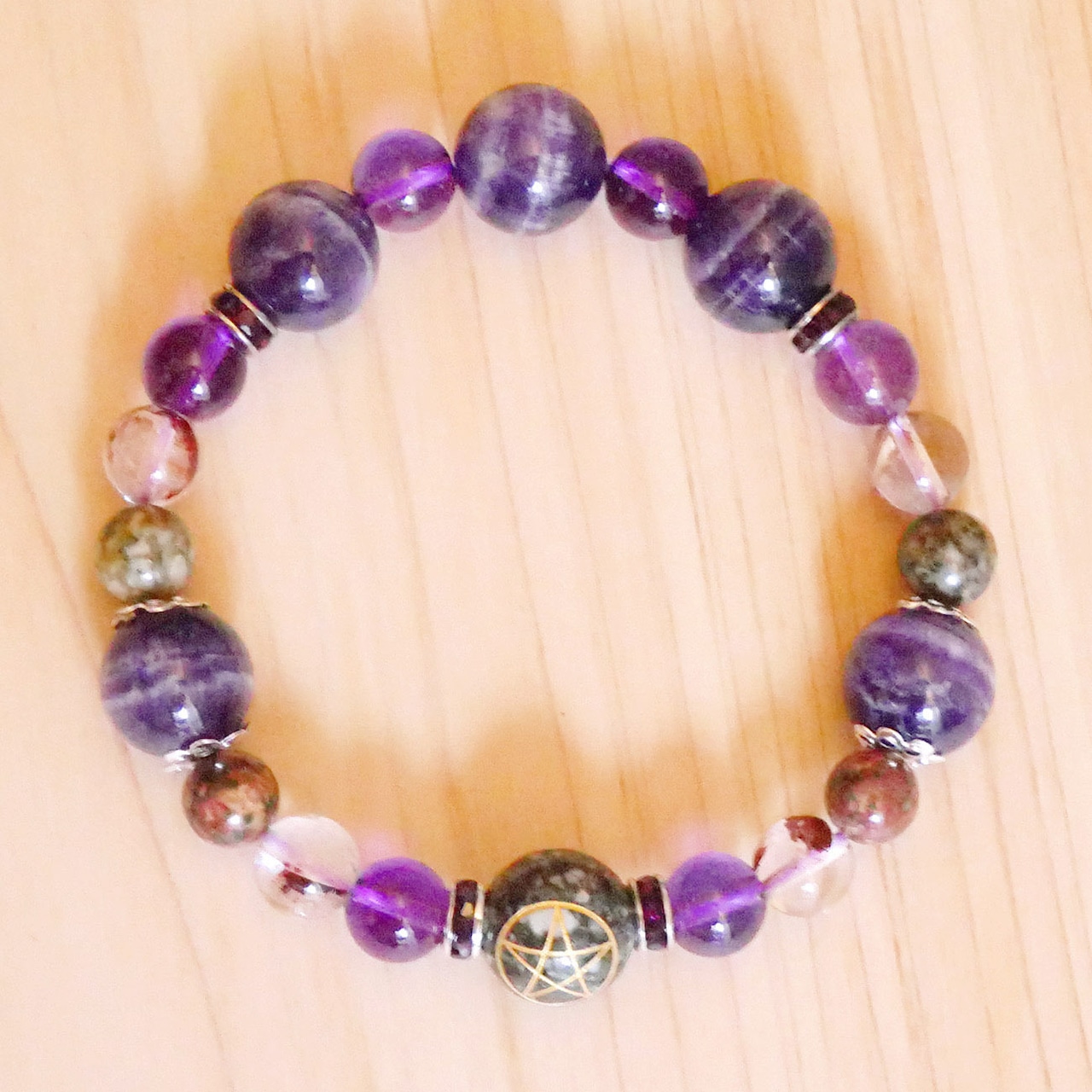 遠野の霊石:12mm 1個 蓮花石:8mm 赤系・緑系各2個 シェブロンアメジスト:12mm 5個 リモナイトインアメジストファントム:8mm 4個 アメジスト:8mm 6個