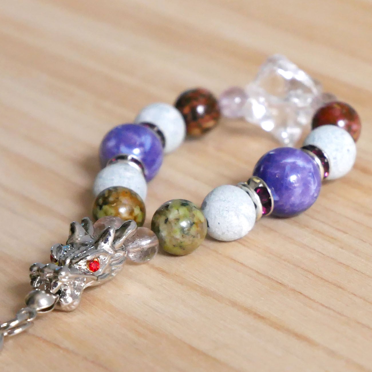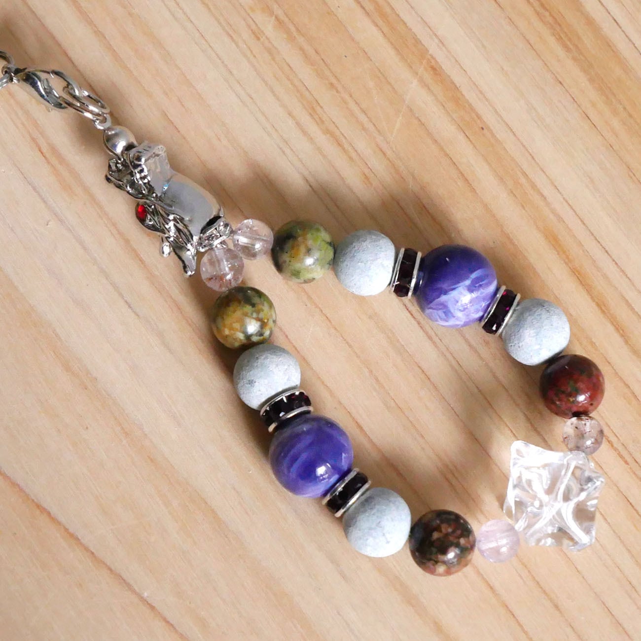 蓮花石:8mm 赤系・緑系各2個 トゥインクルアメジスト:10mm 2個 タツナイト:8mm 4個 スーパーセブン:5mm 4個 マカバ水晶:15mm 1個