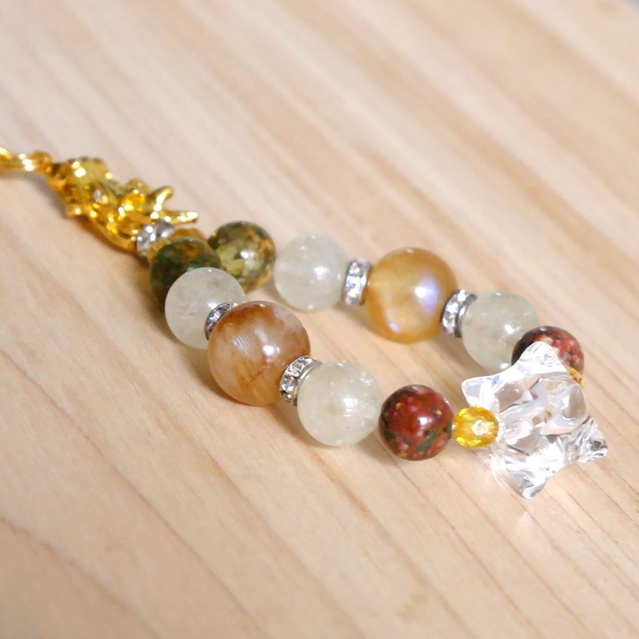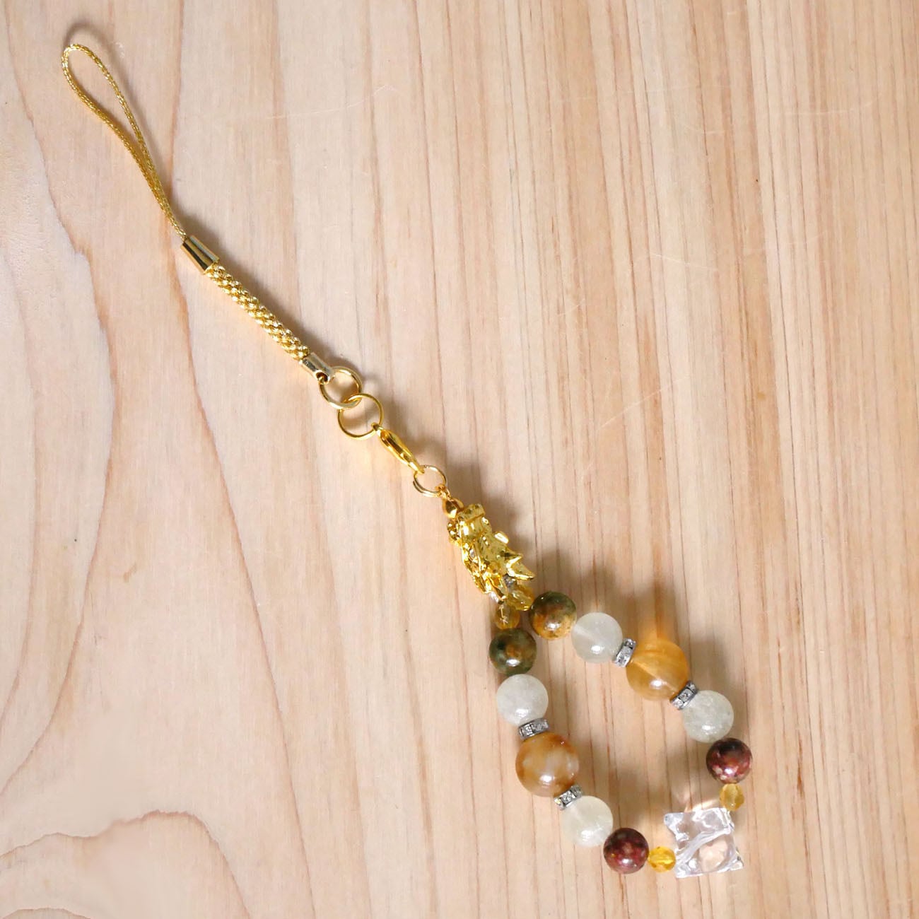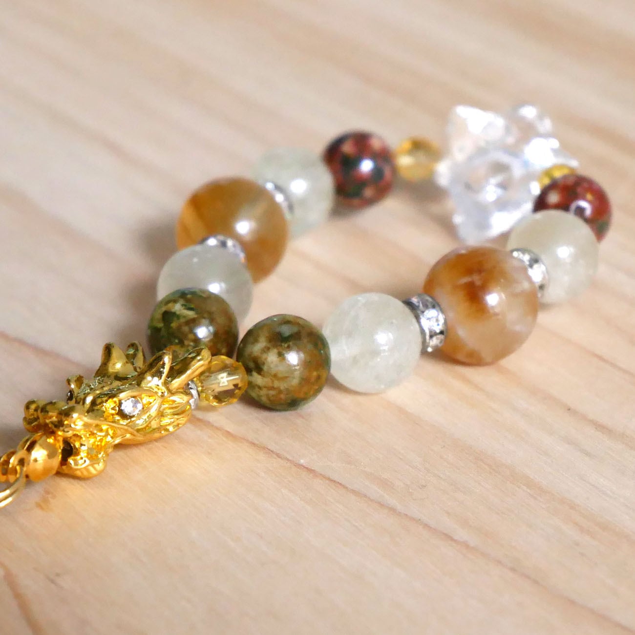 【希少!ゼロ磁場蓮花石付き金龍ストラップ】プラジオクレースムーンストーン・リビアングラス・シトリン・マカバ水晶 開運 邪気除け