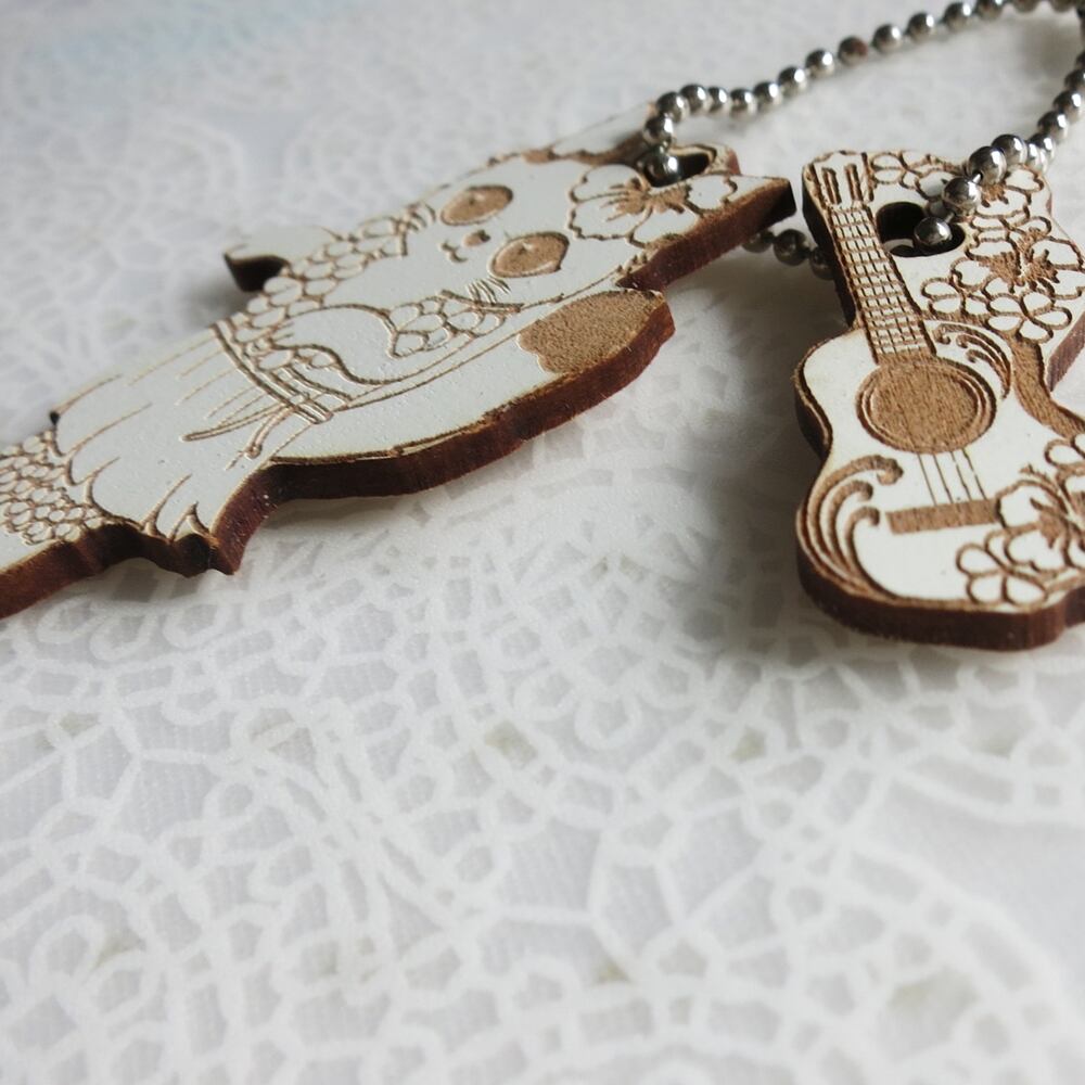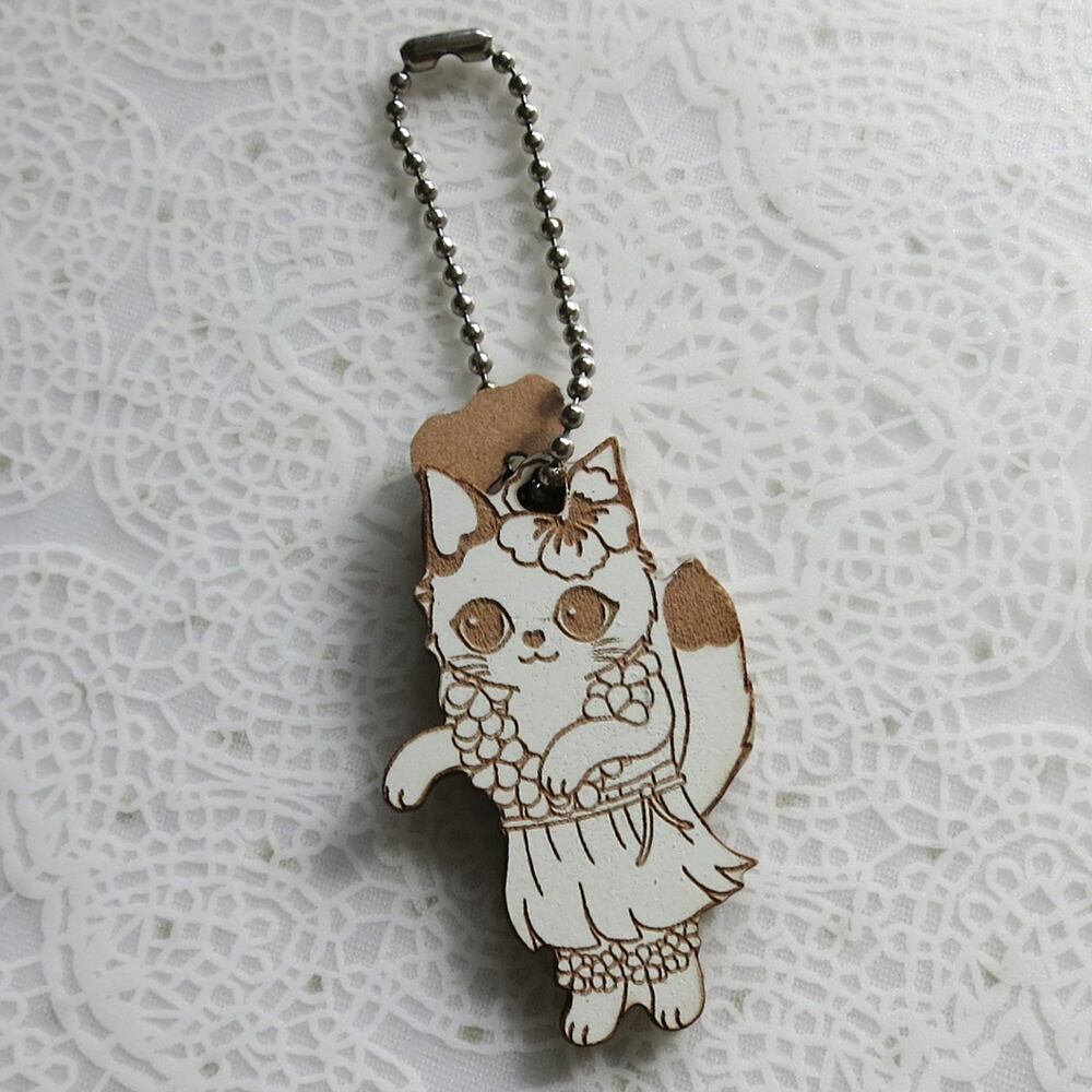 ハイビスカスの髪飾りとプルメリアのレイとアンクレット・パウスカートを着て、フラダンスしている猫とウクレレのチャームです。