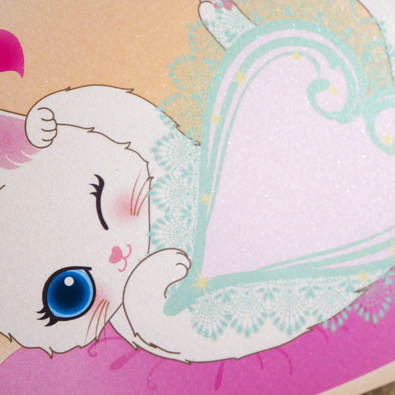 白い仔猫がころんと寝転がりレースのハートカードを持って、ウィンクして招きポーズをしている愛らしい猫ちゃんイラストのメッセージカードです。