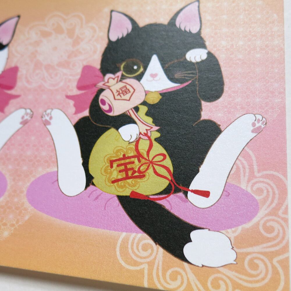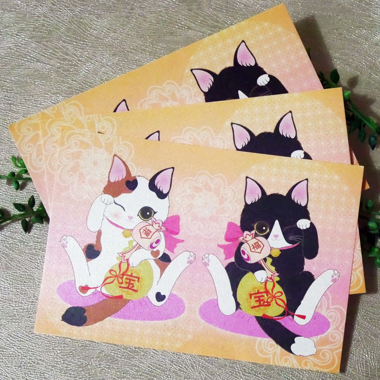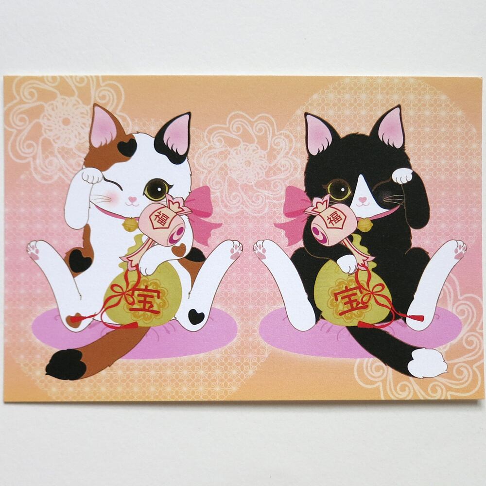 ハート三毛猫&八ワレ黒猫のダブル招き猫イラストのメッセージカード(3枚セット)です。