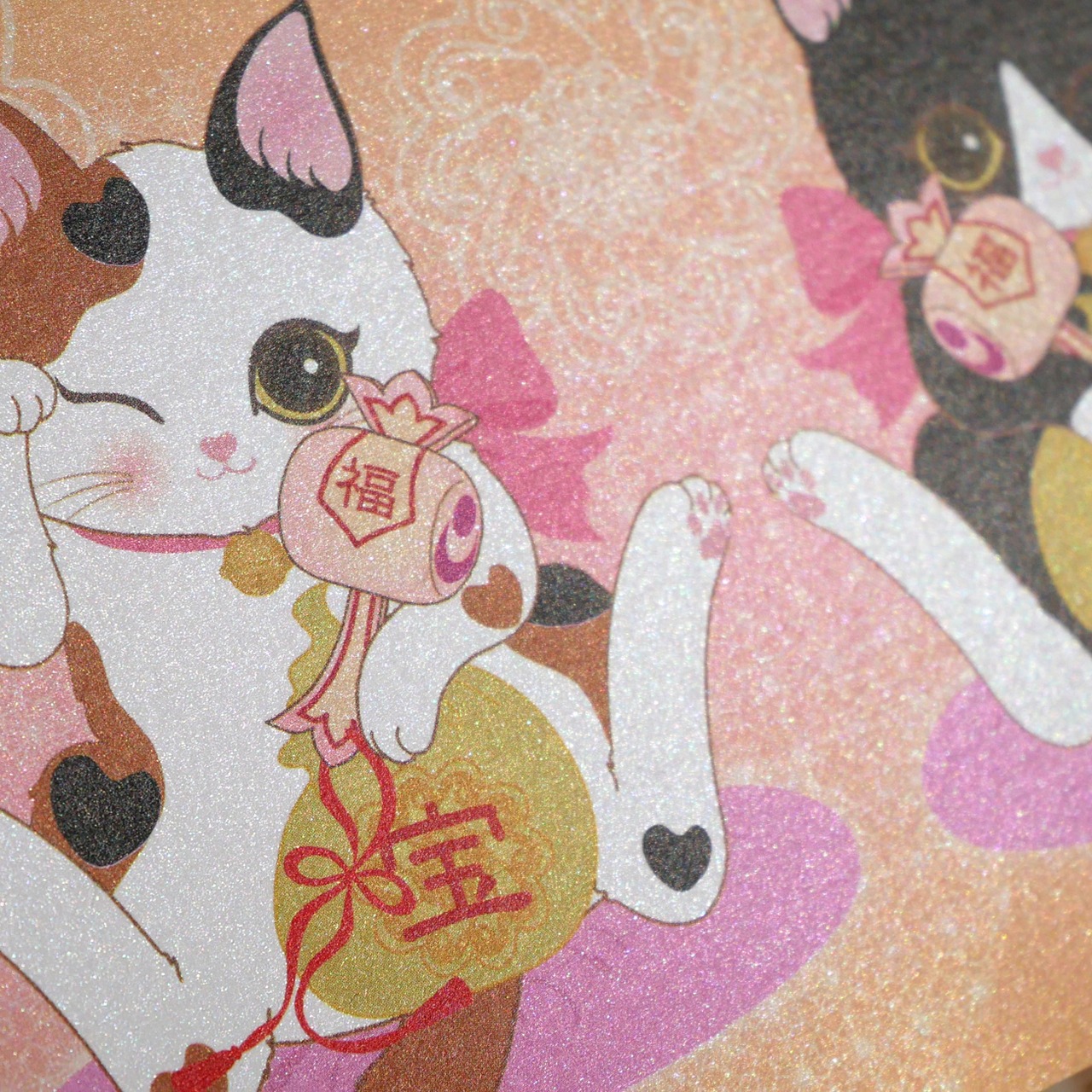 高級パール紙☆ダブル招き猫メッセージカード3枚セット ハート三毛猫&八ワレ黒猫