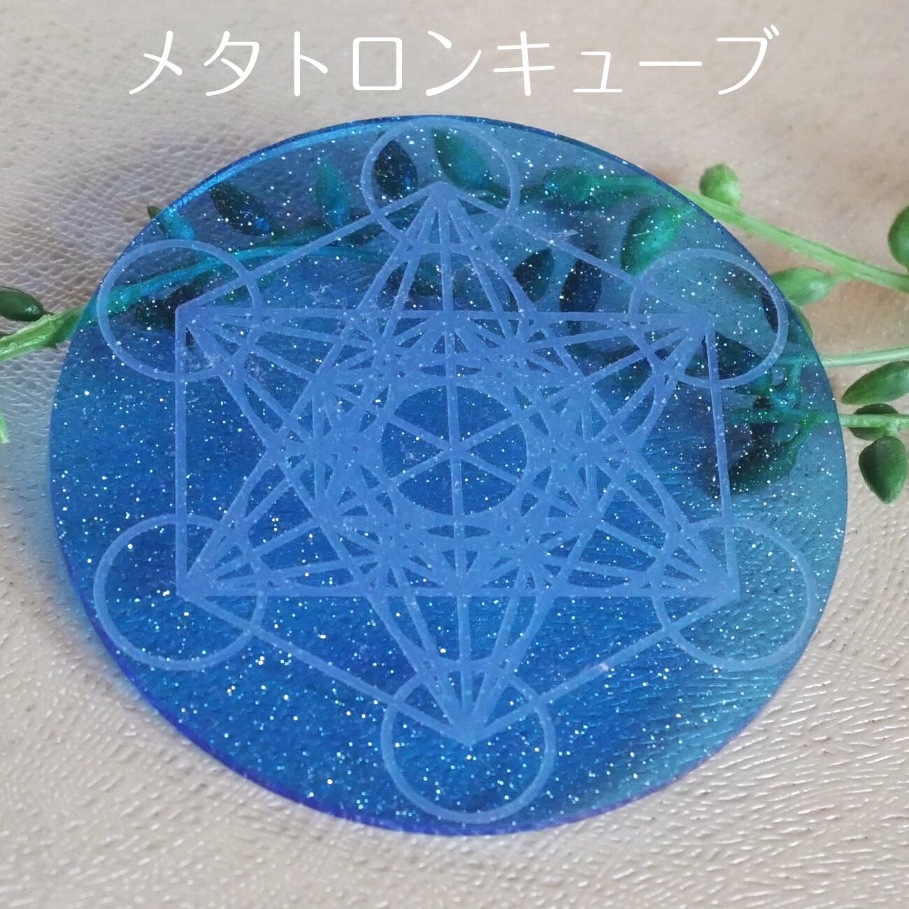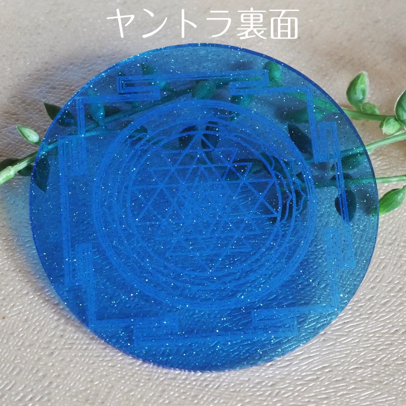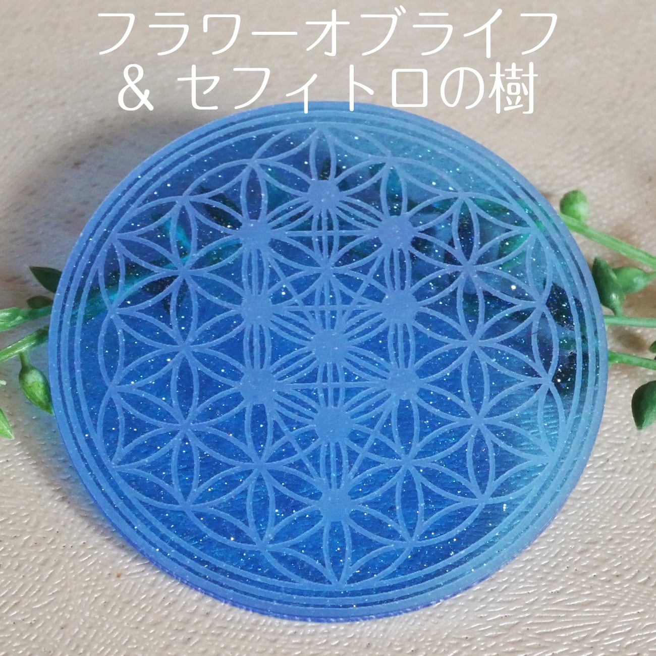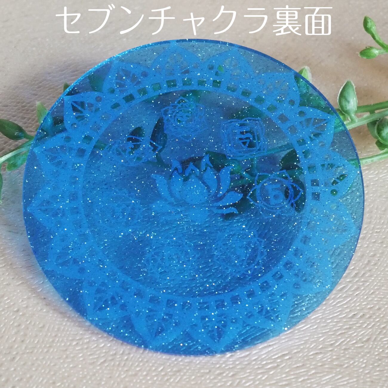 神聖幾何学模様をラメ入ブルーのアクリル板にレーザー彫刻したプレートです。