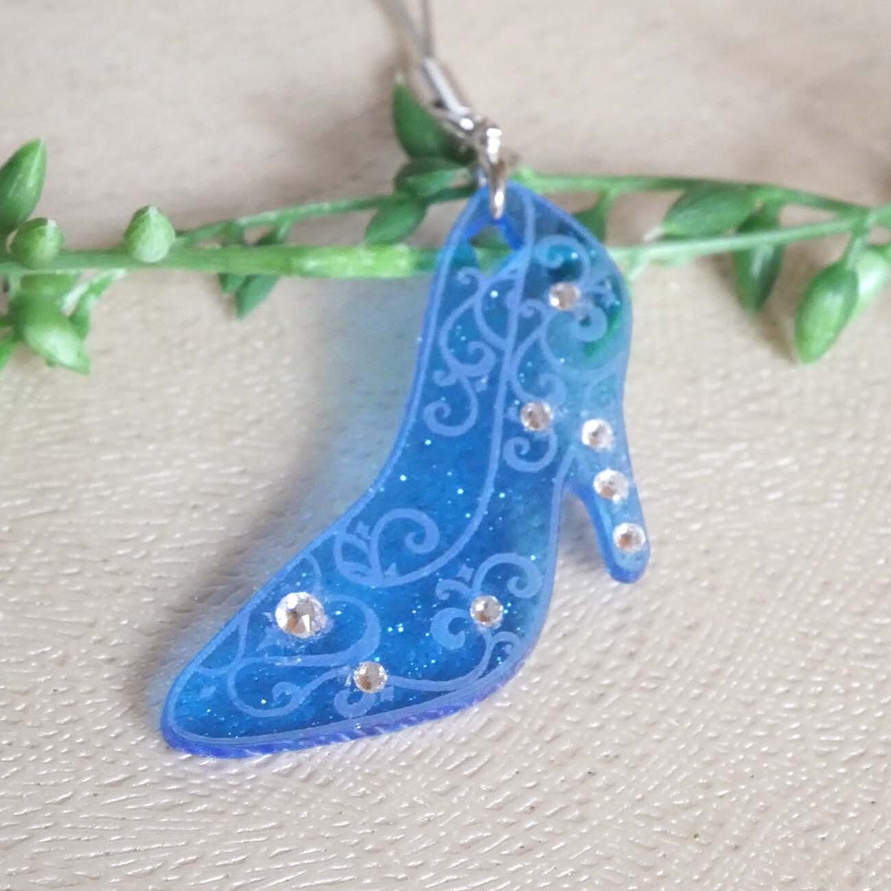 シンデレラのガラスの靴のイメージで描いたアラベスク柄のハイヒールイラストをラメ入ブルーのアクリル板にレーザー彫刻したチャームです。