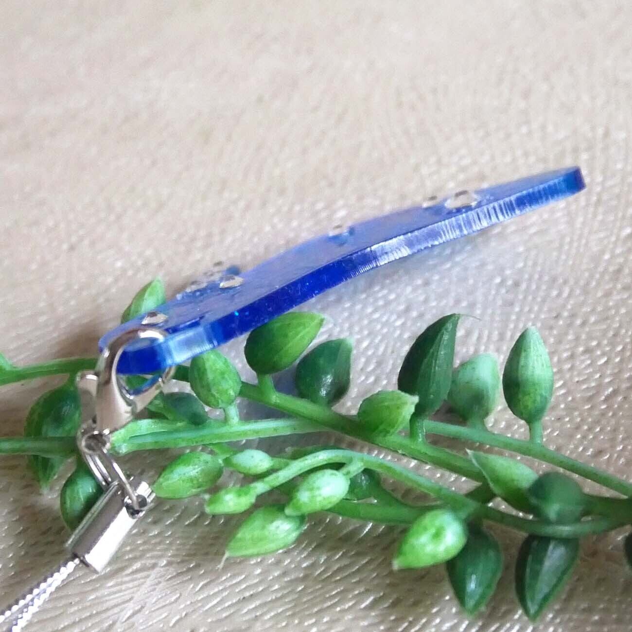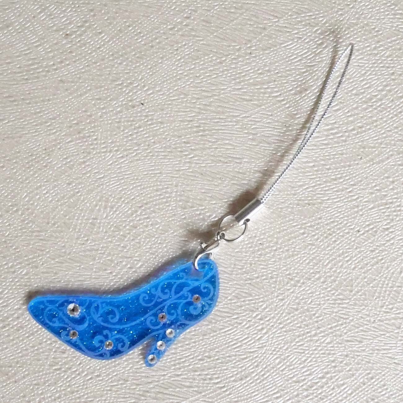 ガラスの靴スワロフスキーラインストーン付ハイヒールキーホルダー ラメ入ブルー アクリル製ストラップ