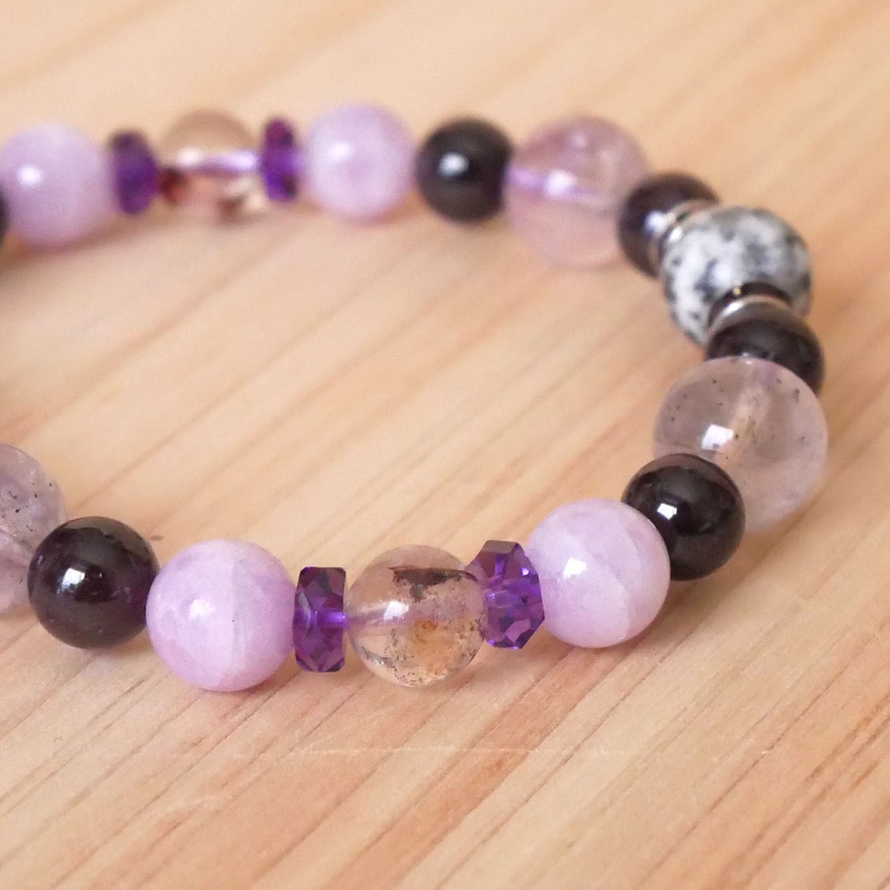 八郷雲龍石:10mm 2個 リモナイトインアメジストファントム:8mm 2個 アメジストエレスチャル:11mm 4個 クンツァイト:9mm 4個 スターガーネット:8mm 8個 アメジスト:6✕3mm 4個 アメジストロンデル:6✕3mm 4個